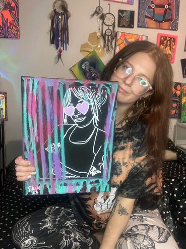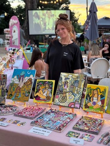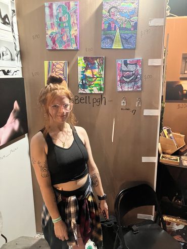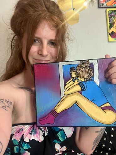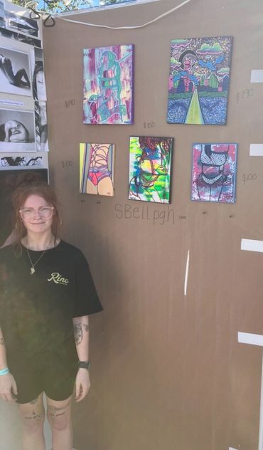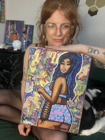 From Pittsburgh to Austin, Sbell has been on this current series of ladies since 2020, developing a unique style with often bright colors, shibari, floral imagery, tattoos, halos, and shoes. She likes to think of her work as Pop Art, getting inspiration from friends, models, and sex workers.
